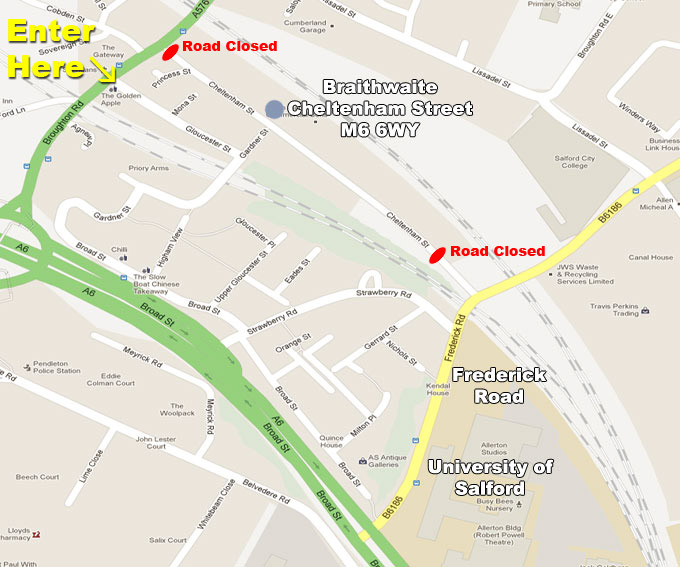 Diversions are in place and Cheltenham Street can now be accessed via Gloucester Street (then Gardner Street) which is off Broughton Road/Cromwell Road (A576).